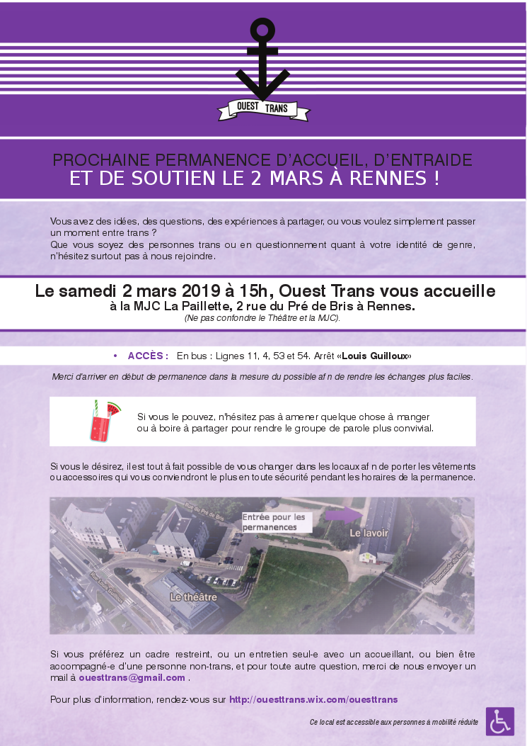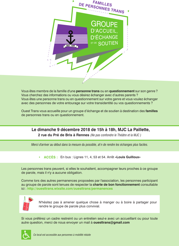 Le samedi 1er décembre 2018 à 15H, Ouest Trans vous accueille à la MJC La Paillette, 2, rue du Pré de Bris à Rennes (Ne pas confondre le Théâtre et la MJC).