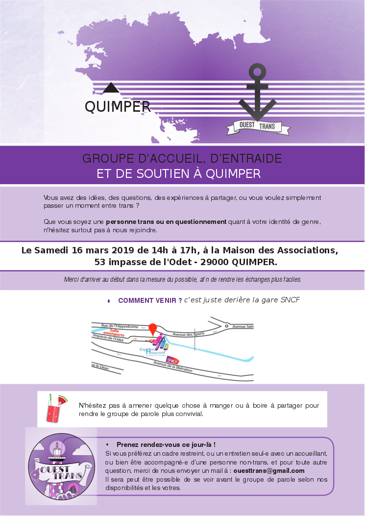 Si vous préférez un cadre restreint ou un entretien seul-e avec un accueillant ou bien être accompagné-e d’une personne non-trans, et pour toute autre question, merci de nous envoyer un mail à ouesttrans[at]gmail.com .