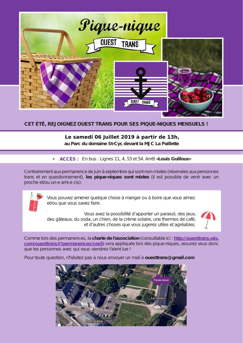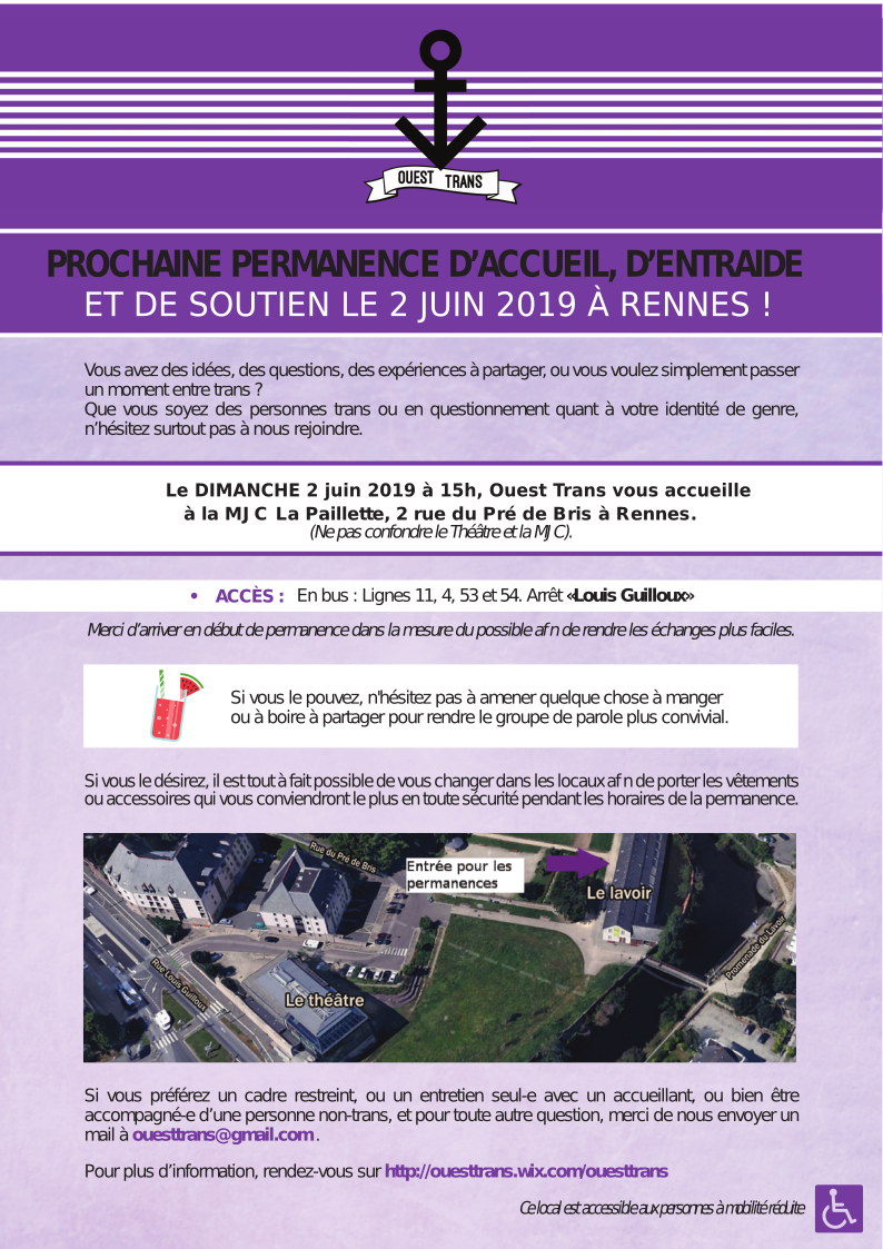 Le samedi 6 avril 2019 à 15H, Ouest Trans vous accueille à la MJC la Paillette, 2 rue du pré de Bris à Rennes .